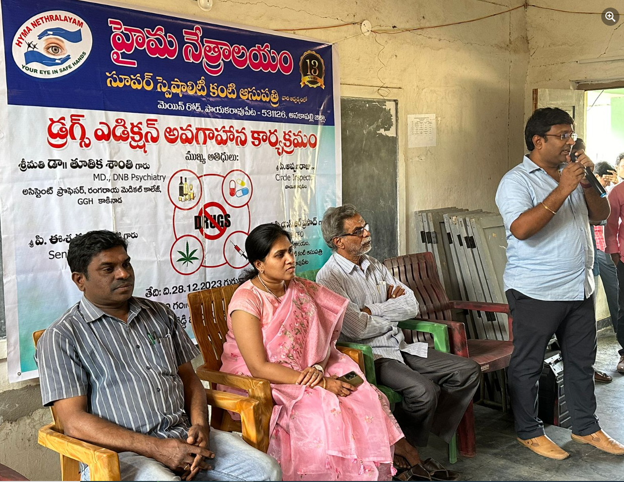 29TH DECEMBER 2023, హైమ నేత్రాలయం సూపర్ స్పెషాలిటీ కంటి ఆసుపత్రి ఆధ్వర్యం లో ఈరోజు డ్రగ్స్ ఎడిక్షన్ అవగాహనా కార్యక్రమము మన పాయకరావుపేట లో గల సమయమంతుల రెడ్డి జూనియర్ కళాశాల నందు నిర్వహించడం జరిగింది . ఈ కార్యక్రమం లో ముఖ్య అతిధులు గా డా .,తూతిక శాంతి గారు ( MD ,DNB Psychiatry ) అసిస్టెంట్ ప్రొఫెసర్ ,రంగరాయ మెడికల్ కాలేజ్ ,GGH కాకినాడ . P .అప్పలరాజు ( సర్కిల్ ఇన్స్పెక్టర్ ) పాయకరావుపేట ,P .ఈశ్వర భరద్వాజ గారు ( సీనియర్ అడ్వకేట్ ) తుని .డా., పి.యస్ .ఆర్ ప్రసాద్ గారు MD & CEO హైమ నేత్రాలయం ,పాయకరావుపేట మరియు అడపా ప్రకాష్ మాస్టర్ గారు ,కాలేజ్ స్టాఫ్ మరియు ఆసుపత్రి స్టాఫ్ పాల్గొనడం జరిగింది .ఈ కార్యక్రమాన్ని ఉద్దేశించి డా., శాంతి గారు ప్రస్తుత కాలం లో యువత డ్రగ్స్ కి బానిస అయి తమ ఆరోగ్యం తో పాటు జీవితాన్ని చిన్నా భిన్నం చేసుకుంటున్నారు .డ్రగ్స్ అలవాటు చేసుకోవటం వల్ల తప్పుడు మార్గాలను ఎంచుకోవడం జరుగుతుంది మరియు మెదడు కి సంభంధించిన సమస్యలు నరముల లో బలహీనత , అరవడం ,చిరాకు పడడం,కోపం, నిద్ర పట్టక పోవడం వంటి అనేక ఆరోగ్య సమస్యలు ఎదుర్కోవడం జరుగుతుంది అని చెప్పడం జరిగింది .