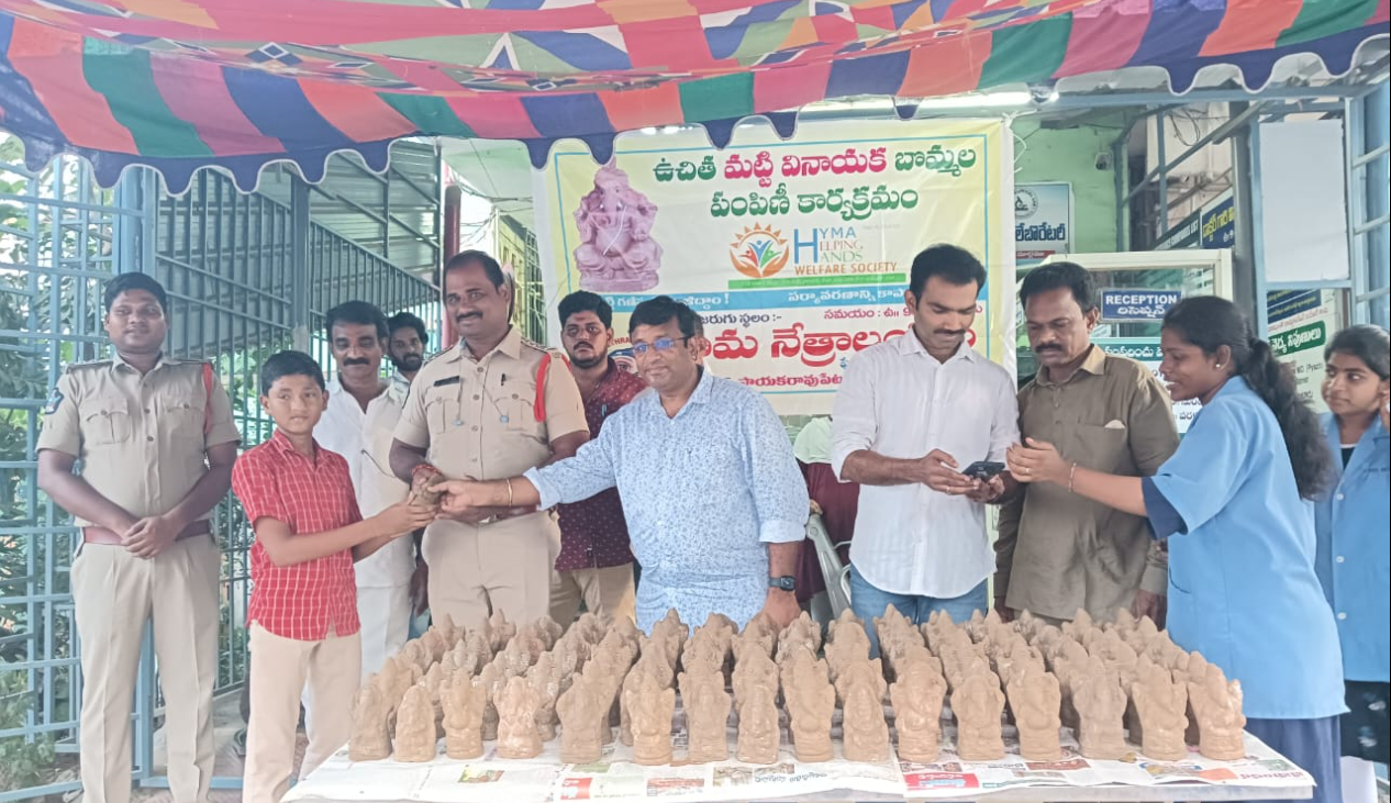 16 SEPTEMBER 2023 డా .పి.ఎస్ .ఆర్. ప్రసాద్ గారు ఆధ్వర్యం లో హైమ నేత్రాలయం పాయకరావుపేట నందు ఈరోజు మట్టి వినాయకుని ప్రతిమలు ఉచితము గా అందజేసే కార్యక్రమం చేయడం జరిగింది . ఈ కార్యక్రమం లో పాయకరావుపేట C I పి . అప్పలరాజు గారు అలానే డాక్టర్ M .K .రెడ్డి గారు (గొడిచర్ల PHC ప్రభుత్వ వైద్యనిపుణులు),పాయకరావుపేట ఎస్ .ఐ . జోగా రావు గారు ,మామిడి వెంకటేశ్వర రావు గారు , అడపా ,ప్రకాష్ మాస్టర్ గారు ముఖ్య అతిధులుగా విచ్చేసి మట్టి వినాయకుని ప్రతిమలు అందరికి అందజేయడం జరిగింది . ఈ కార్యక్రమాన్ని ఉద్దేశించి సి ఐ గారు ప్రకృతి పట్ల అవగాహనా అలానే కెమికల్స్ తో చేసిన వినాయకుని ప్రతిమలు వాడడం వలన ఎన్నో ఆరోగ్య సమస్య లు వస్తున్నాయి చెప్పడం జరిగింది . ఇలాంటి కార్యక్రమాలు మరెన్నో చేయాలనీ చెప్పడం జరిగింది .