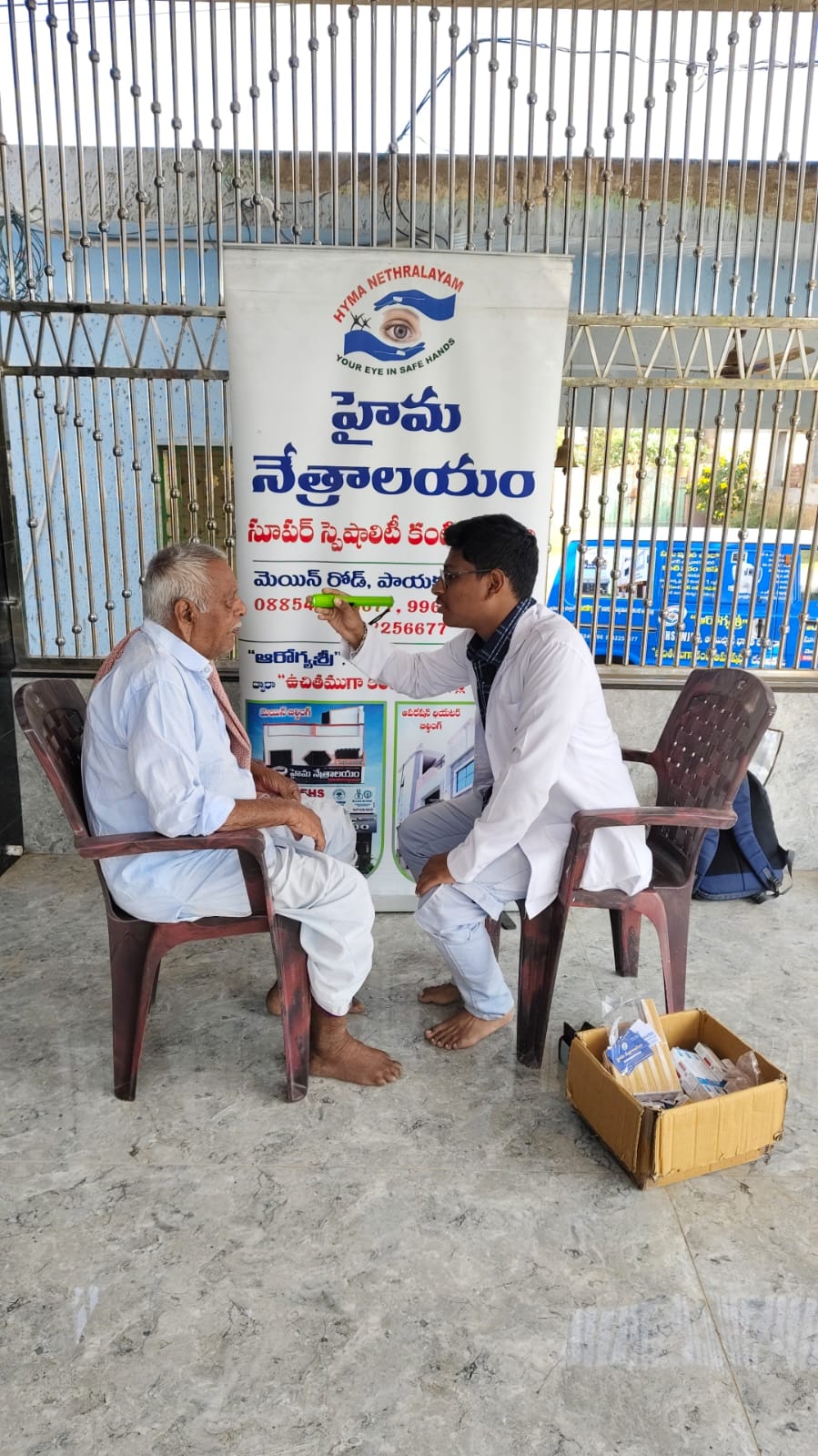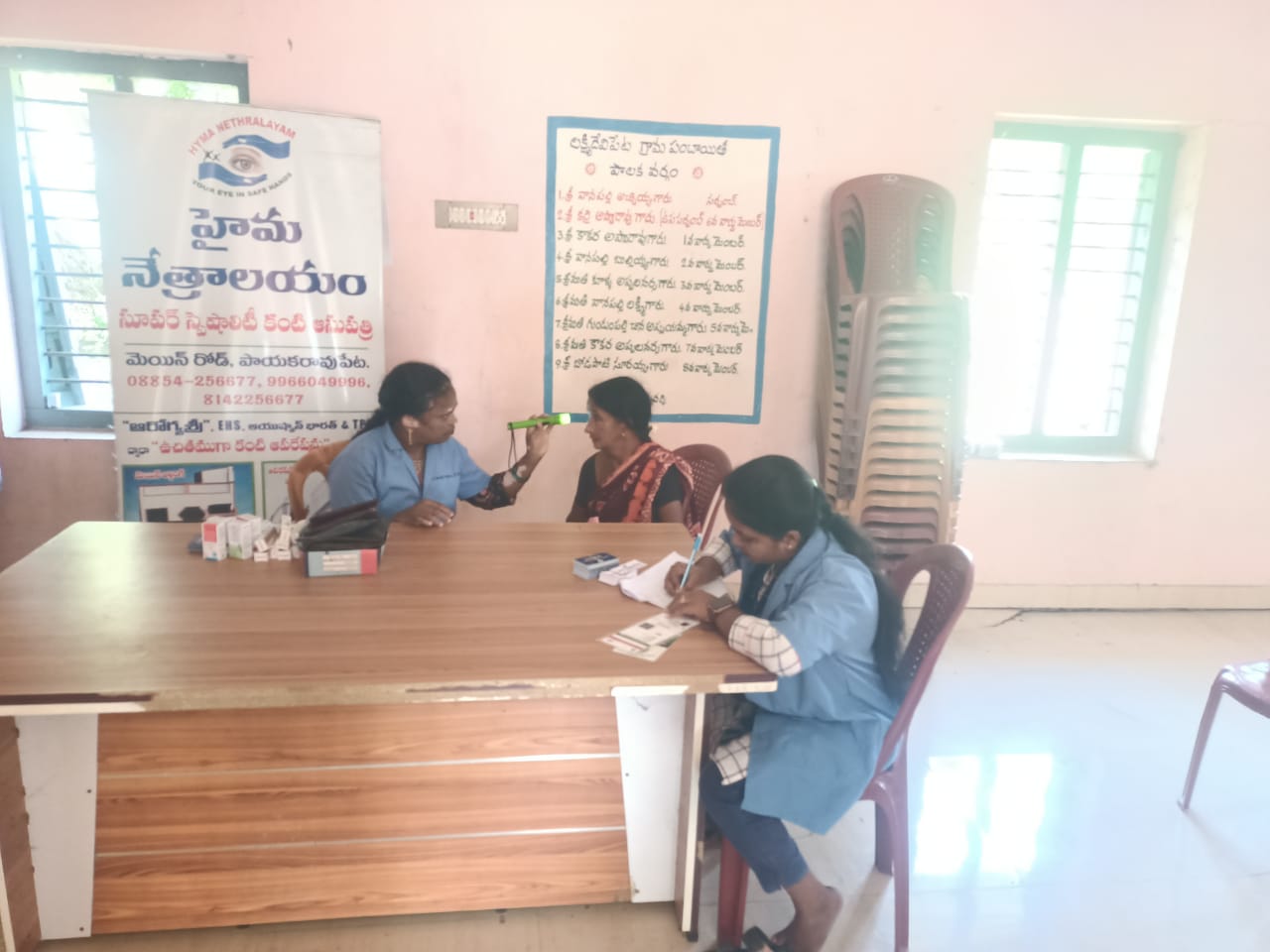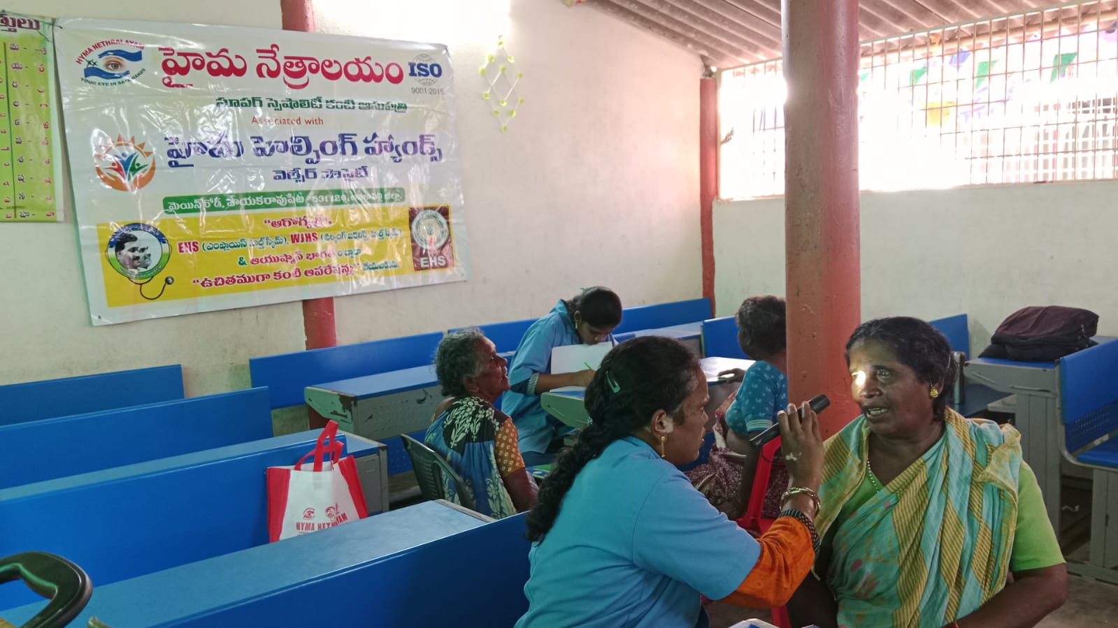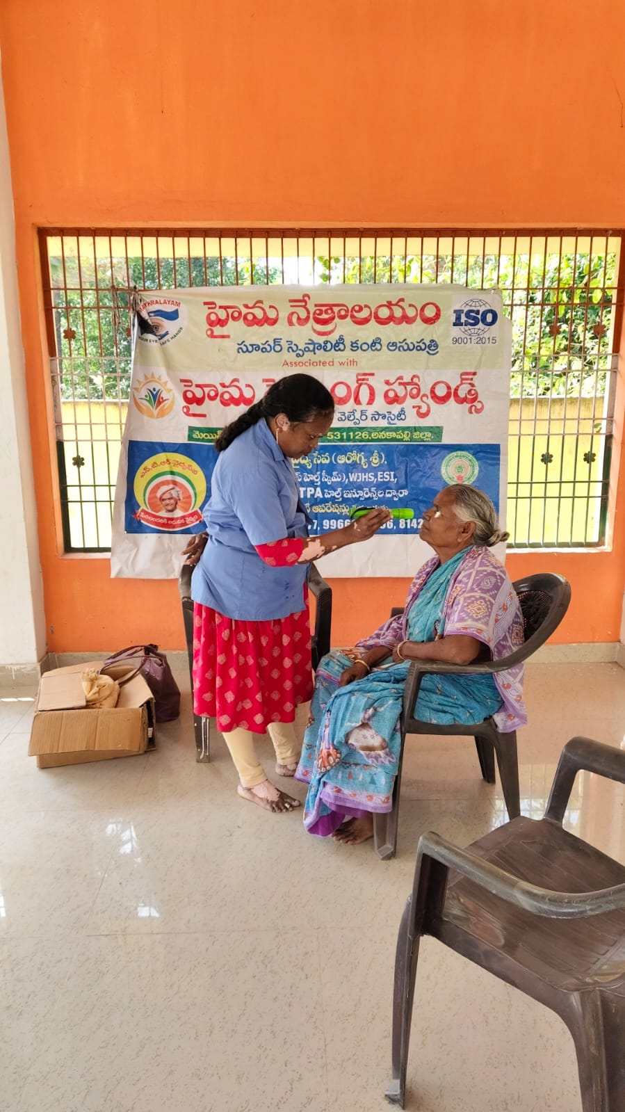 హైమ నేత్రాలయం సిబ్బంది EYE DROPS అందచేస్తున్న దృశ్యం