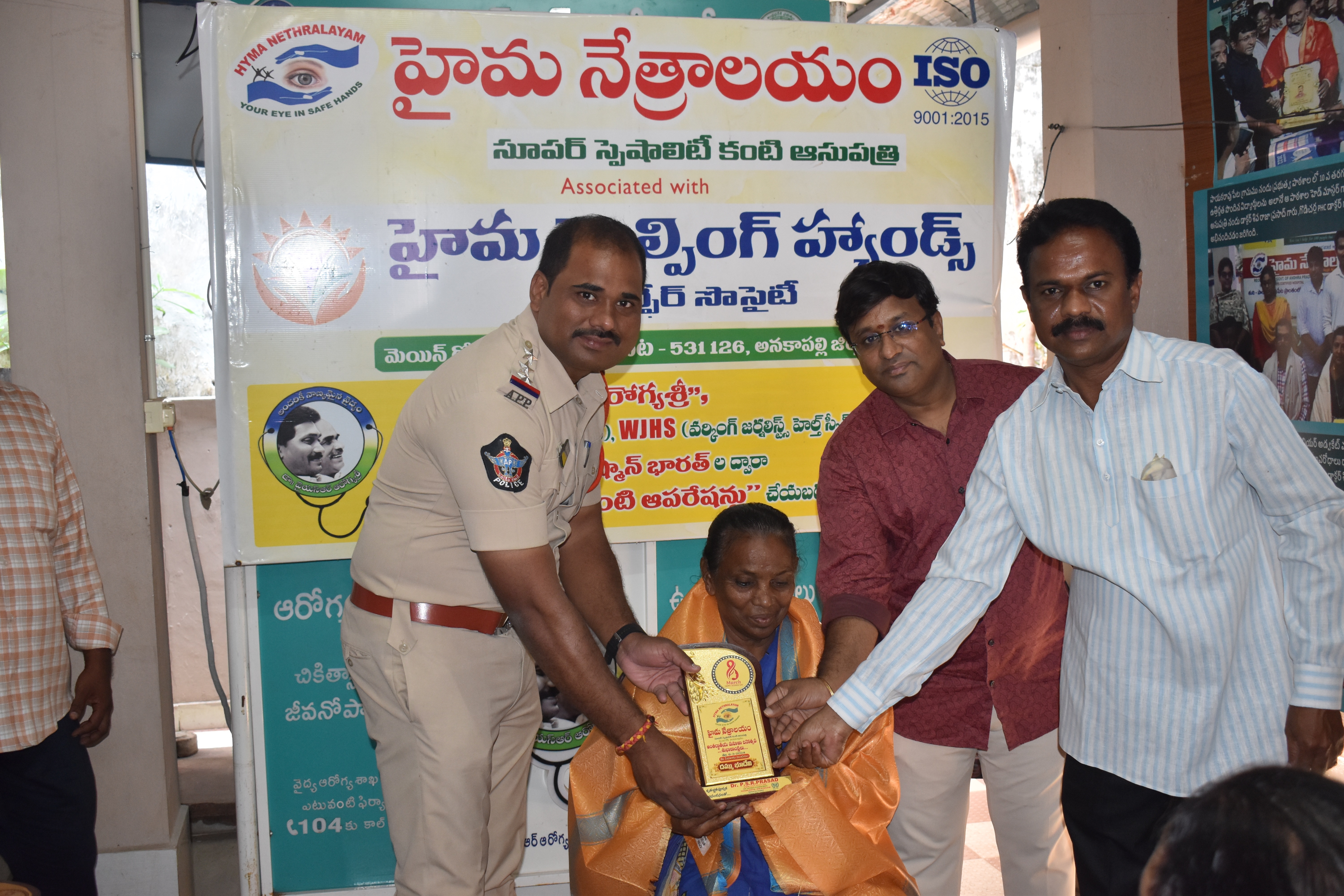 హైమ నేత్రాలయం వారు అంతర్జాతీయ మహిళా దినోత్సవం సందర్బంగా పాయకరావుపేట పారిశుధ్య మహిళా కార్మికులను సన్మానిస్తున్న DR.P.SHIVA RAJA PRASAD గారు మరియు అతిధి గ విచ్చేసిన సి.ఐ అప్పలరాజు మరియు హైమ నేత్రాలయం సిబ్బంది.